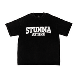 A heavyweight 275GSM, 100% cotton tee with a deep acid-wash finish that gives the fabric rich texture and a soft, broken-in feel. Cut with an oversized silhouette that drapes clean while keeping structure, and finished with a bold varsity Stunna Attire front logo for a classic athletic look.